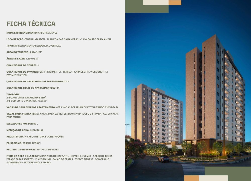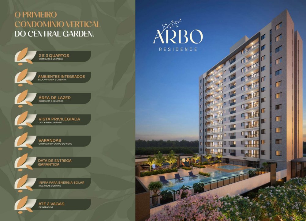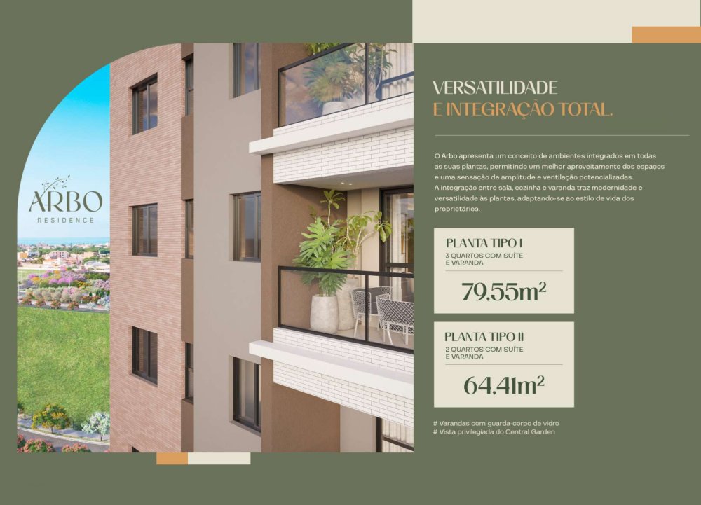O Arbo Residence é o primeiro condomínio de apartamentos do Central Garden, a mais nova área planejada de Aracaju, que une imóveis residenciais e comerciais com infraestrutura completa para se viver e investir. O Arbo está localizado numa área super privilegiada, há poucos minutos de tudo que você precisa, com acesso principal pela Av. Beira Mar, há 5 minutos da Orla da Atalaia e da UNIT. O novo lançamento da Celi traz um conceito de ambientes integrados, permitindo um melhor aproveitamento dos espaços e uma sensação de amplitude e ventilação potencializados. A integração entre sala, cozinha e varanda traz modernidade e versatilidade às plantas.