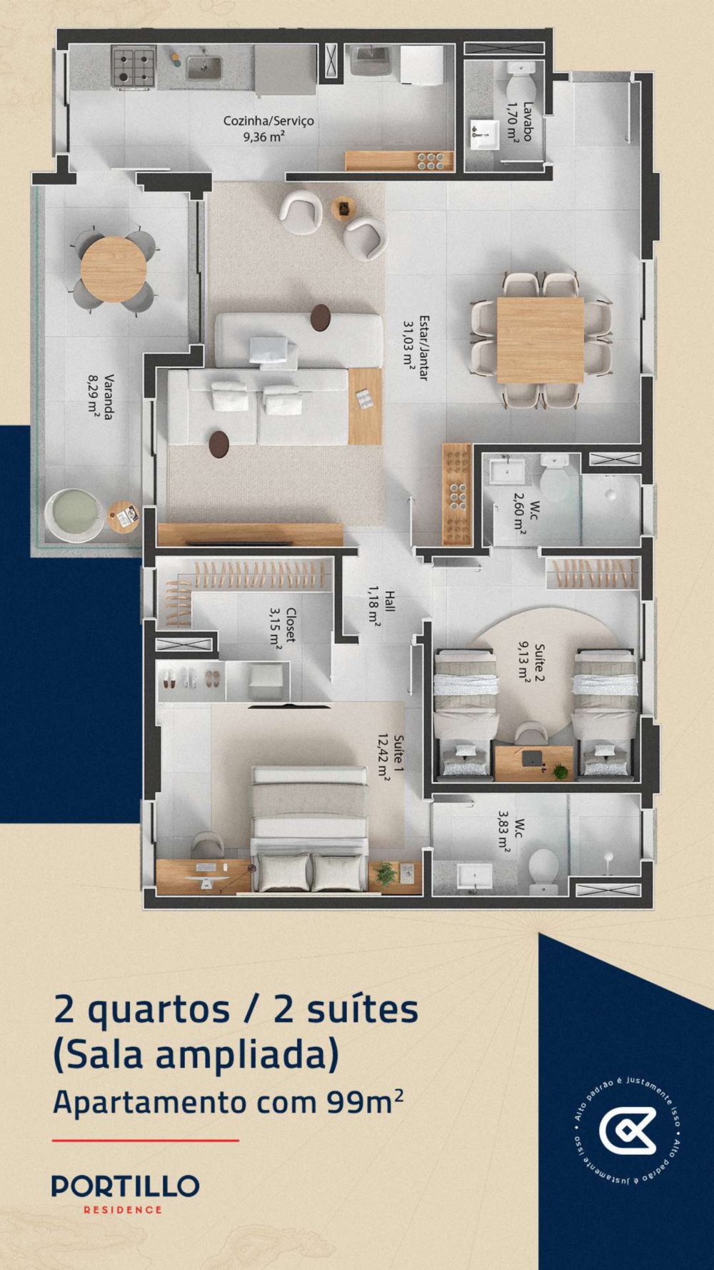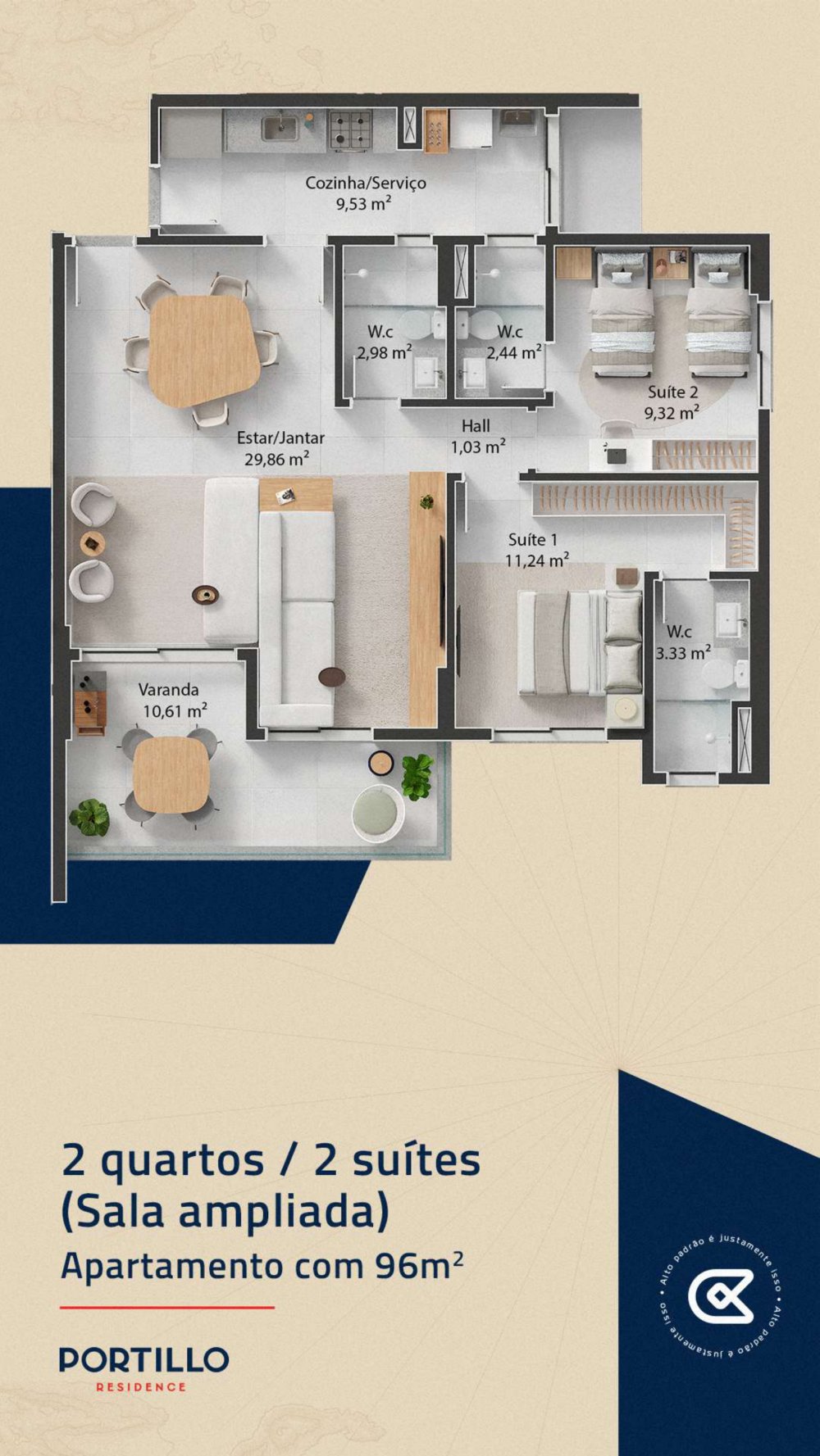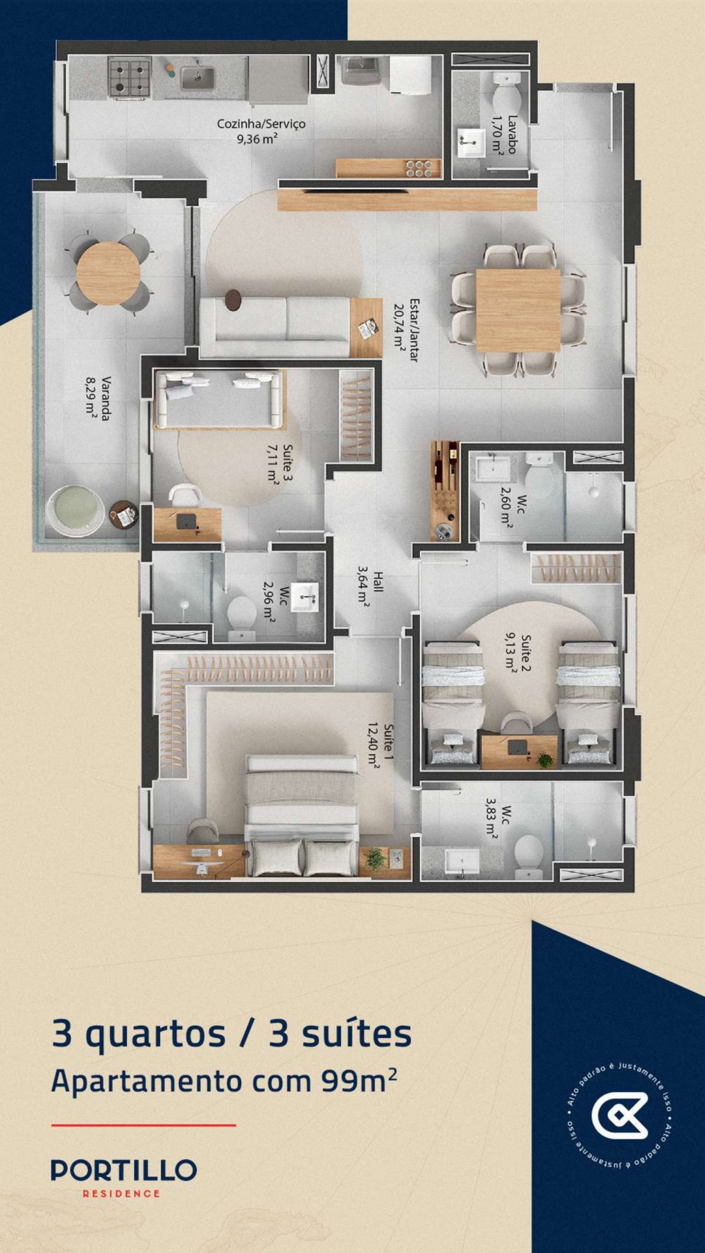 Portillo Residence, o primeiro lançamento de alto padrão da Constren no bairro Atalaia, projetado para quem busca qualidade de vida, conforto e elegância. Localizado em uma área de fácil acesso e tranquilidade, o Portillo une o estilo sofisticado ao melhor que Aracaju tem a oferecer. Plantas Inteligentes e Espaços Aconchegantes: Com opções de apartamentos de 68, 83, 96 e 99 m², cada detalhe foi cuidadosamente pensado para oferecer uma experiência única e completa. A Melhor Localização no Atalaia, o Portillo está a poucos passos da icônica Passarela do Caranguejo, um dos pontos turísticos mais vibrantes de Aracaju. Um convite para desfrutar da rica gastronomia, cultura e arquitetura local.