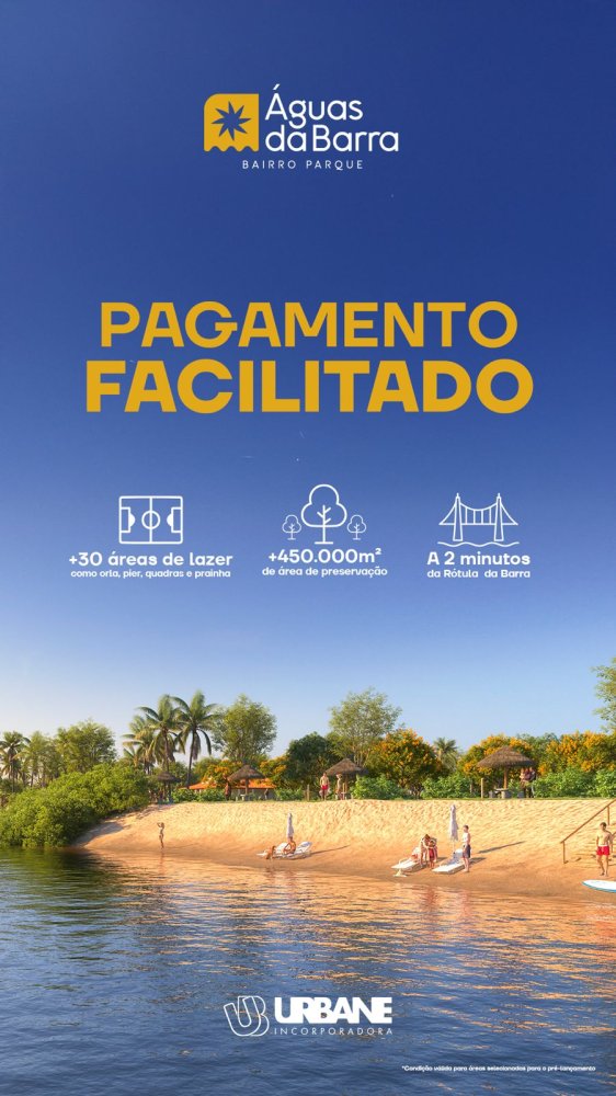 A Urbane Incorporadora apresenta o Complexo Águas da Barra, um empreendimento singular que promete transformar o Bairro Parque em um novo destino residencial e comercial na Barra dos Coqueiros. Com 1.226 lotes, tamanhos a partir de 200 m², e uma ampla área verde de 450.000 m². Veja mais!