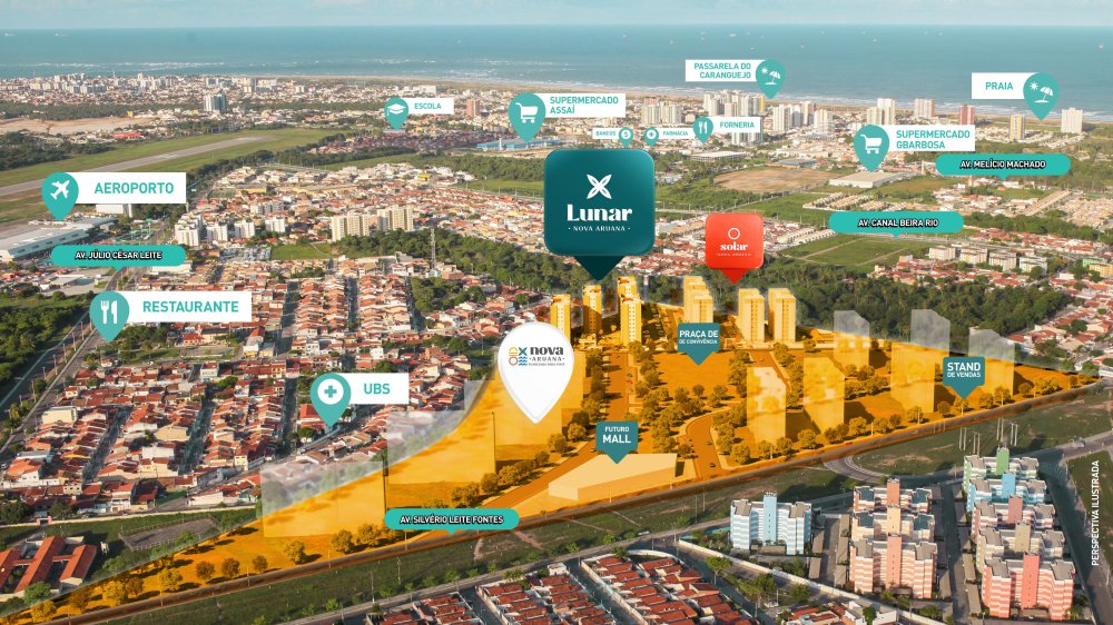 Localizado na área planejada da FFB, a 400 metros da Avenida do Aeroporto e a 5 minutos da praia, o Lunar Nova Aruana oferece apartamentos de até 56,17 m² com dois quartos (uma suíte), sala integrada à varanda, piso laminado, infraestrutura para ar-condicionado split e varanda com guarda-corpo de vidro. Faça sua simulação pelo Programa Minha Casa Minha Vida (MCMV). A área de lazer é completa, equipada e decorada, com quadra recreativa, espaço gourmet, salão de jogos, pet play, academia, piscina adulto e infantil com prainha, entre outras opções. Investimento a partir de R$ 203.063,52.